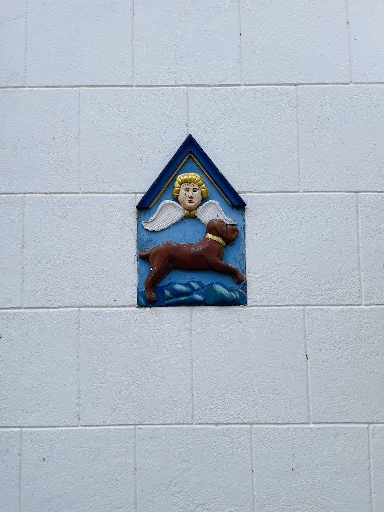 Ergens in Hindeloopen hangt een steen van een vrouw met een hond. Dit is het