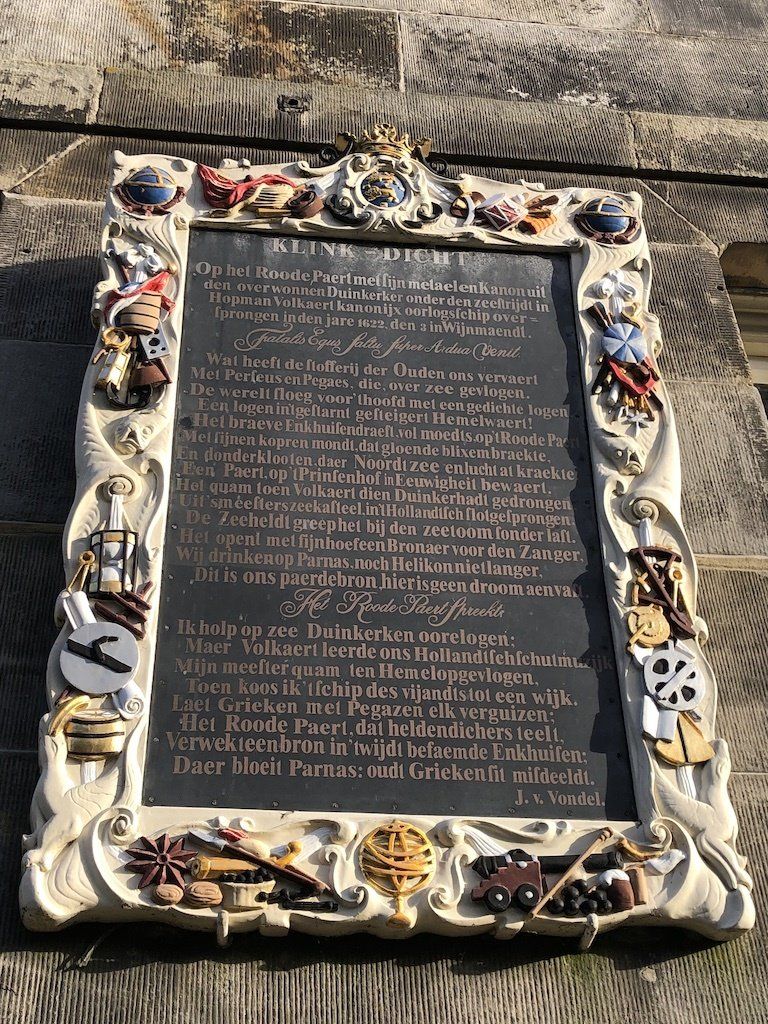 Het stadhuis van Enkhuizen is een heel groot en mooi gebouw. Je kunt aan dit stadhuis zien hoe rijk Enkhuizen was in de Gouden Eeuw. Aan de muur van het stadhuis hangt een gedicht. Dit is een gedicht van Joost van den Vondel. Hij was een belangrijke dichter in de Gouden Eeuw.